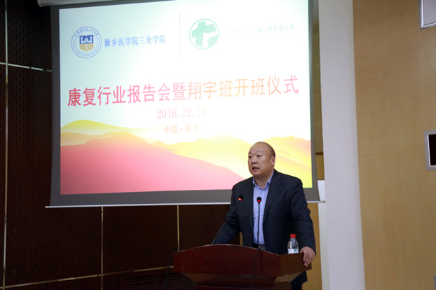 1215日下午,我院在平原校区行政楼学术报告厅举行首届“翔宇班”开班仪式。翔宇医疗设备有限责任公司总董事长何永正、人力资源部部长李治锋、董事长秘书周健、我院党委书记王志凯、副书记王金文、副院长王彦杰、教务长杜华贞出席,新乡医学院第一附属医院康复科主任郭学军、我院相关部门负责人以及“翔宇班”学员、相关专业两百余名同学共同参加了此次开班仪式,仪式由院长办公室主任史世锋主持。