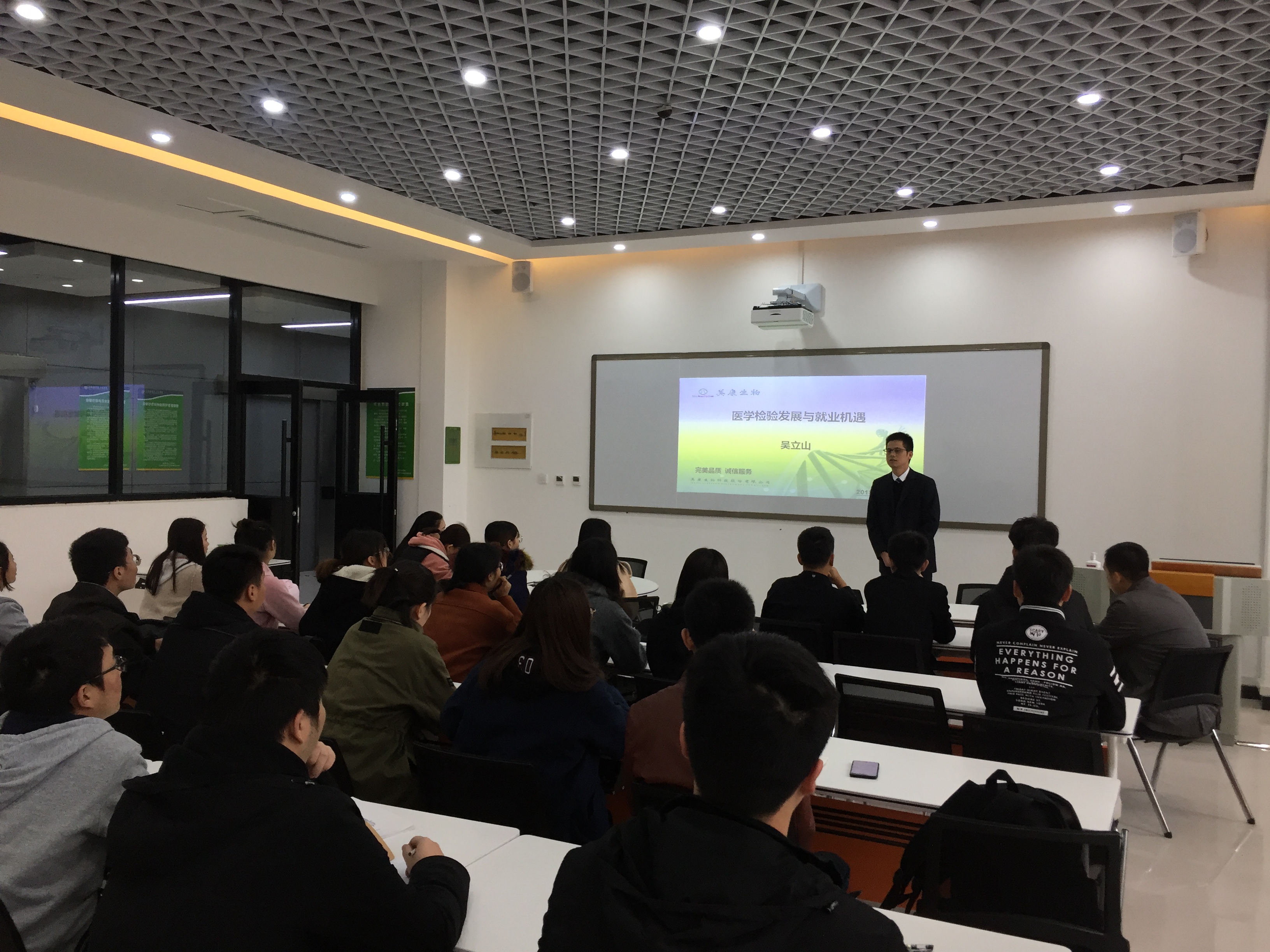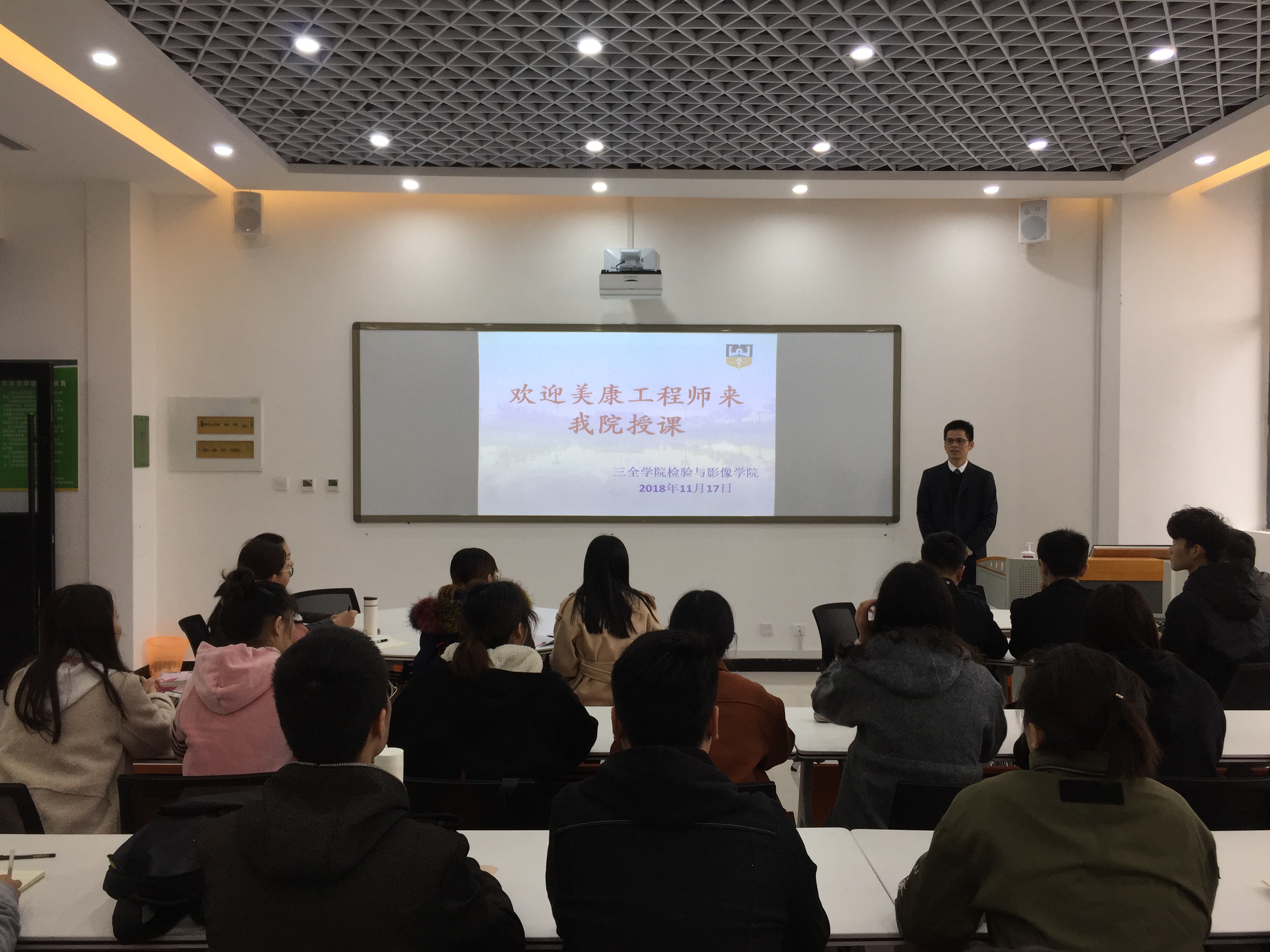 11月17日下午,我校首届“美康工程师班”在平原校区影像实训中心核磁实训室正式开课,由美康生物科技股份有限公司全国检验实验室技术副总监吴立山为“美康工程师班”的同学们主讲“医学检验发展与就业机遇”。 课堂上,为了让同学们更全面的了解检验行业未来的发展趋势和检验毕业生日后就业的方向,吴立山老师从我国的医疗改革、公私立医疗机构对比,讲到检验技术的发展前景,再到国内外第三方检验的差距等几个方面进行了分析,深入浅出的讲解引发了同学们的深思。在互动环节中同学们踊跃发言,针对实习地点、科室轮转、工作内容、考研假期、转正发展等方面吴立山老师做了详细的解答。 通过本次课程,同学们对医院检验科和第三方检验机构有了新的认识,为我院实施学校与企业对接、专业教育与产业对接、课程与职业岗位对接、教学内容与行业标准对接,“四个对接”奠定了基础。