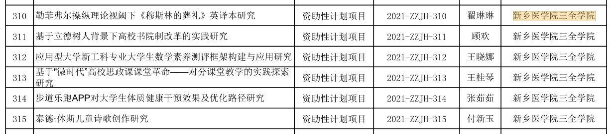 近日,教育厅社会科学研究与语言文字应用管理处公布了2021年度人文社会科学研究一般项目的立项名单,我校9个项目获批立项,其中资助计划项目6项,指导计划项目3项。 2021年度人文社会科学研究一般项目申报工作于2020年1月启动,我校高度重视该项目组织申报工作,各相关院(系、部)积极组织,落实申报计划,督促相关教师申报,科研部合理谋划、精心组织,经过组织申报、专家评审、形式审查等关键环节,按照限额申报要求共计推荐申报20项,确保了申报质量,立项率达到了45%,取得了显著的成效,该类项目的立项对提升我校人文社科研究水平,促进人文社会科学的繁荣和发展具有重要的意义。