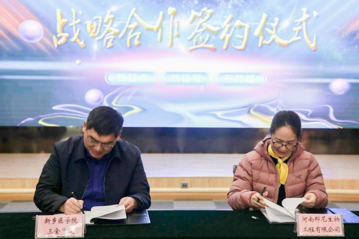 1月12日上午,我校与河南邦尼生物工程有限公司、中国人民健康保险股份有限公司河南分公司战略合作签约仪式在行政楼三楼学术报告厅隆重举行。河南邦尼生物工程有限公司董事长王威、副总经理胡宗杰,中国人民健康保险股份有限公司河南分公司总经理助理王卫国、健康管理部负责人谢卫萍、人事行政部负责人郝博,我校副院长邱永建出席签约仪式,相关部门负责人参加。签约仪式由产教融合办公室主任助理王真真主持。