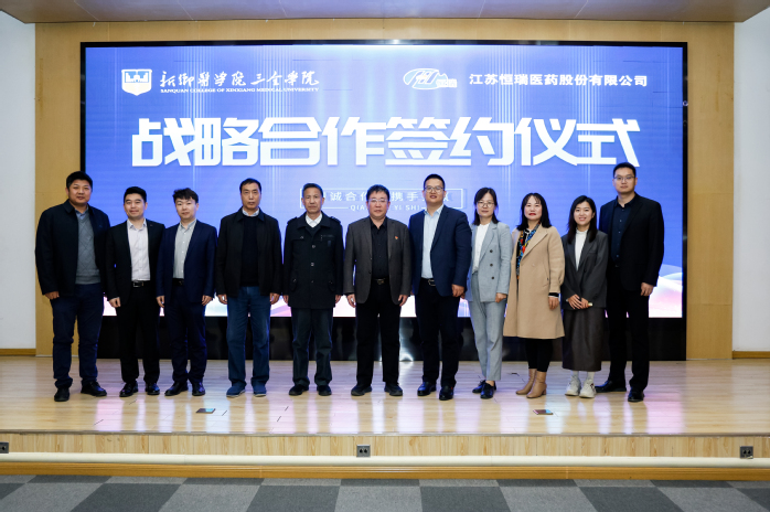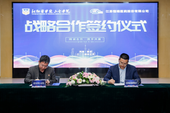 319日上午,我校与江苏恒瑞医药股份有限公司在平原校区行政楼学术报告厅举行战略合作签约仪式。江苏恒瑞医药股份有限公司浙豫冀大区总监张欢欢、免疫线人力资源部总监代二贞、我校常务副院长秦国亮、校企双方相关部门负责人出席活动,共同见证协议签署。签约仪式由产教融合办公室主任助理王真真主持。